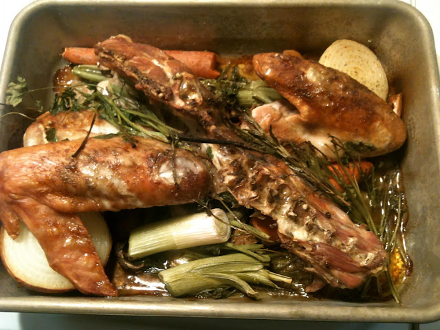 I chose to use a turkey breast because there were only four of us. The turkey breast stays juicy and dripping with delight since it doesn't have to wait for the darker meat to cook. I love the chicharron that the skin creates. It really crackles! When choosing a size appropriate for guests, allow about 1 pound of raw turkey per person. Sounds like a lot, I know, but you want to have leftovers, don't you? That's the best part. Frankly, hot turkey leaves me cold. I love the sandwiches later on Kaiser rolls or Dutch Crunch bread with stuffing, avocado, and cranberry sauce... Yummy, Yummy!!!